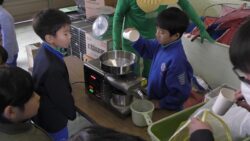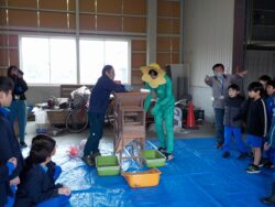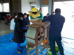 「コロナ禍で希薄になった繋がりを再び結びたい」という思いから、昨年度からサンフラワープロジェクトが始まりました。教室では、昨年度行った取り組みについて渡辺村長から説明を受けました。その後農協へ移動し、ひまわりの種とごみをわける道具、唐箕(とうみ)を使わせてもらいました。ひまわりの種とごみが別の出口から出てくる様子を見て、すごい道具だ!という声が聞こえました。