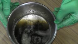 ごみを取り除いた種を油しぼり機に入れると、油としぼりカスが分かれて出てきました。しぼり立ての油は、皮の色が入っているため黒色でしたが、給食に使用するひまわり油は、精製された透明なオレンジ色だということです。