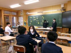 11月にひまわり油の搾油体験をした3年生の教室では、村長さん、教育長さん、住民生活課課長さんが一緒に給食を食べました。村長さんの話を聞いたり、11月の搾油体験の映像を見たりして、思い出を話しながら楽しい会食時間を過ごしました。