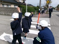 交通安全協会舟橋支部長さんや交通指導員の方々が見守ってくださるなか、すこし緊張しながらも、元気よく歩く姿が印象的でした。