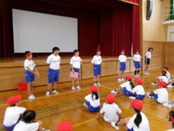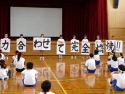 まず、運営委員会による運動会のスローガンの発表がありました。今年度の運動会のスローガンは「力合わせて 完全燃焼!」です。全校で心を合わせて協力し、運動会に全力で取り組もうという意気込みが伝わるスローガンです。