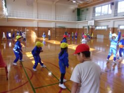 1年生は、体育の学習で「ボール投げゲーム」を行っています。各色団を2つのチームに分け、パス練習をしたり、ゲームをしたりしています。攻め方・守り方を自分たちなりに考え、「人がいないところから投げたら、的に当たるよ」「相手のボールを跳ね返したら、点を入れられないよ」等、様々な工夫をしてゲームをしています。ルールを守ってゲームをすることや友達と協力することなど、ボールを投げることだけではなく、様々なことを学んでほしいと思います。