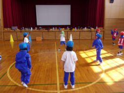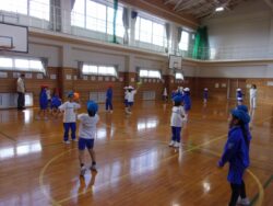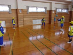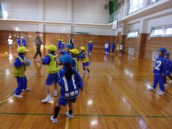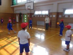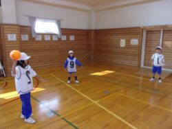 1年生は、体育の学習で「ボール投げゲーム」を行っています。各色団を2つのチームに分け、パス練習をしたり、ゲームをしたりしています。攻め方・守り方を自分たちなりに考え、「人がいないところから投げたら、的に当たるよ」「相手のボールを跳ね返したら、点を入れられないよ」等、様々な工夫をしてゲームをしています。ルールを守ってゲームをすることや友達と協力することなど、ボールを投げることだけではなく、様々なことを学んでほしいと思います。