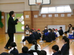保健委員会からは、舟橋村地域学校保健委員会の中で学んだ「立腰(りつよう)パワーアップ体操」の紹介がありました。よい姿勢で過ごすための体操として「膝かかえ」「片足立ちー横8の字」「手のひらタッチ」「ツイストタッチ」の4つが紹介されました。子供たちは少し苦戦しながらも、保健委員会のお手本を見ながら、楽しそうに体操に取り組んでいました。これからも、立腰を意識して生活していきましょう。