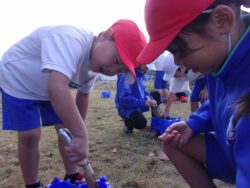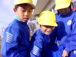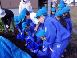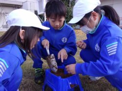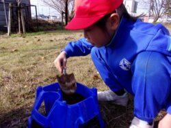 11月27日(木)に、チューリップの球根を植えました。ハーティ班に分かれて、1・2年生が協力して活動しました。鉢に堆肥、土の順に入れて、3色の中から自分が選んだ球根を2つ植えました。2年生のお兄さん、お姉さんが土の入れ方や球根の植え方を優しく教えてくれて、1年生は楽しく活動することができました。
