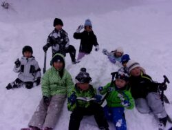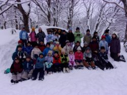 集合写真の後は、色団に分かれ「尻滑り」と「雪像づくり」を楽しみました。尻滑りでは、滑る度にコースがつるつるになり、子供たちは「きゃー」と歓声を上げながら、何度も滑っていました。雪像づくりでは、バケツやシャベル等を使って、ミニかまくらや椅子等を作っていました。