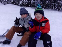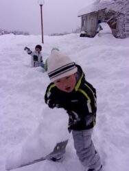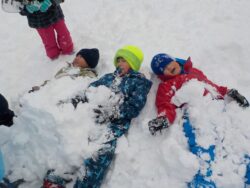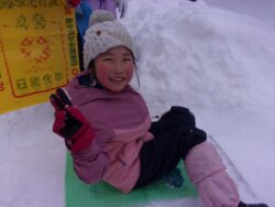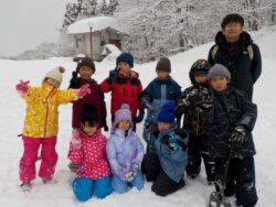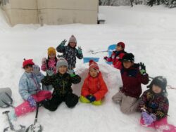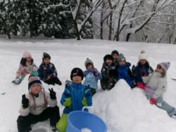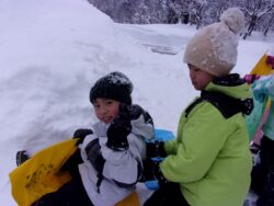 集合写真の後は、色団に分かれ「尻滑り」と「雪像づくり」を楽しみました。尻滑りでは、滑る度にコースがつるつるになり、子供たちは「きゃー」と歓声を上げながら、何度も滑っていました。雪像づくりでは、バケツやシャベル等を使って、ミニかまくらや椅子等を作っていました。