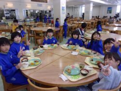 活動後は、食堂でお昼ご飯を食べました。たくさん遊んだ後の子供たちは、何度もおかわりをしていました。