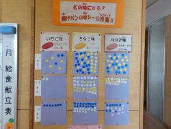 週間中に揚げパンの味シール投票も行いました。いちご味、きなこ味、ココア味の中で一番多く投票された味が3月の給食に登場します。投票の結果、106人が投票したきなこ味に決定しました。