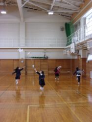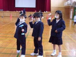 今日は、体育館で作ったおもちゃで遊びました。送風機を使って風を起こすと、「風車」や「かざわ(風を受けて回るおもちゃ)」がよく回り、子供たちは大喜びでした。「ストローひこうき」を作った子供たちは、友達と飛ぶ距離を競い合っていました。「凧」を作った子供たちは、思い切り走ると凧が高く揚がり、何度も走って楽しんでいました。