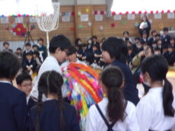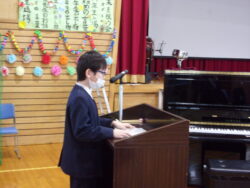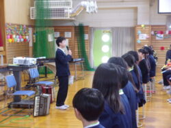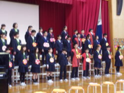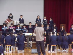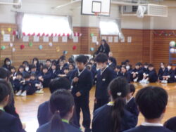 その後、時代劇風のかけ声とともに、6年生からのお返しとして各学年へのメッセージの呼びかけと合唱を行いました。また、先生方から6年生へ向けての合唱のサプライズプレゼントもありました。