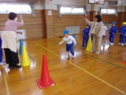 短縄では、一斉に跳び始め、一番長く前跳びを跳び続けられるか「前跳び選手権」を行っています。自分が跳び終わっても、同じ色団の友達の応援をする姿が微笑ましいです😆前跳びや後ろ跳びがとても上手になり、縄跳びカードの記録も伸びてきました。