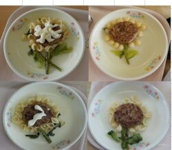サンフラワーピラフ、はなびらサラダ、ひまわりスープに使われています。ハンバーグのまわりに花びらの形をしたマカロニを飾り、マヨネーズで種の部分を書いて、ひまわりのできあがりです。