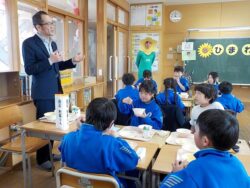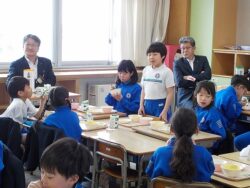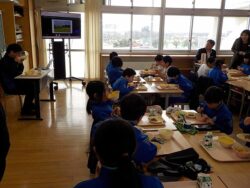 11月にひまわり油の搾油体験をした3年生の教室では、村長さん、教育長さん、住民生活課課長さんが一緒に給食を食べました。村長さんの話を聞いたり、11月の搾油体験の映像を見たりして、思い出を話しながら楽しい会食時間を過ごしました。