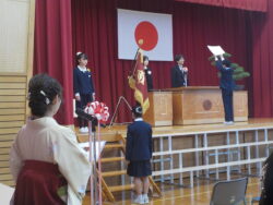 卒業式後の門出の式では、1年生から卒業生に花束を渡した後、卒業生代表と村長さんが万歳を行いました。最後に、卒業生を参加者全員の拍手で見送りました。