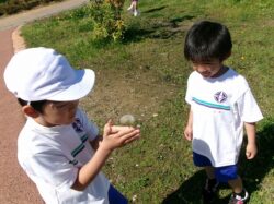 10月21日(月)に、裏庭・児童公園・オレンジパークで生き物探しをしました。バッタ、チョウ、トンボ、セミがいて、子供たちは元気に走り回りながら、生き物を捕まえていました。