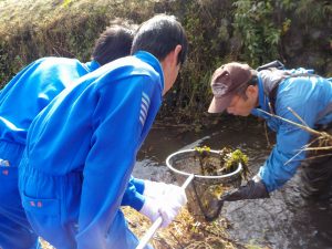 今までに竹鼻用水で見たことのない魚を発見しました。6年生は学校に持ち帰り、「ブルーギルに似ているよね?でも、ブラックバスにも似ているかな?」と、種類を調べています。いずれにしろ、特定外来生物ではないかと心配しています。絶滅危惧種のトミヨの住んでいる用水です。早くこの魚の種類を調べていきたいと思います。